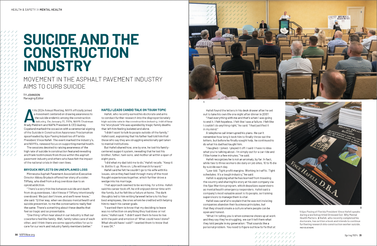 Ajax Paving Industries of Florida President Vince Hafeli recognizes he is not an anomaly, by far. In fact, while two to three workers die daily on job sites, 10 to 15 die by suicide each day.